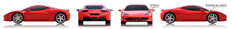 Dans la capacité à réunir les meilleurs ingrédients pour nous faire vibrer, Ferrari excelle encore et toujours. La Ferrari 458 Italia le prouve à la perfection: avec son moteur V8 explosif, son châssis redoutable et toujours cette surprenante facilité de prise en main (palettes au volant oblige), cette composition typiquement italienne offre des saveurs plus relevées que jamais. Il faudra néanmoins faire preuve d'humilité puisqu'elle vous propose quand même 570ch sur les roues arrières et c'est peu de le dire, profitez-en!